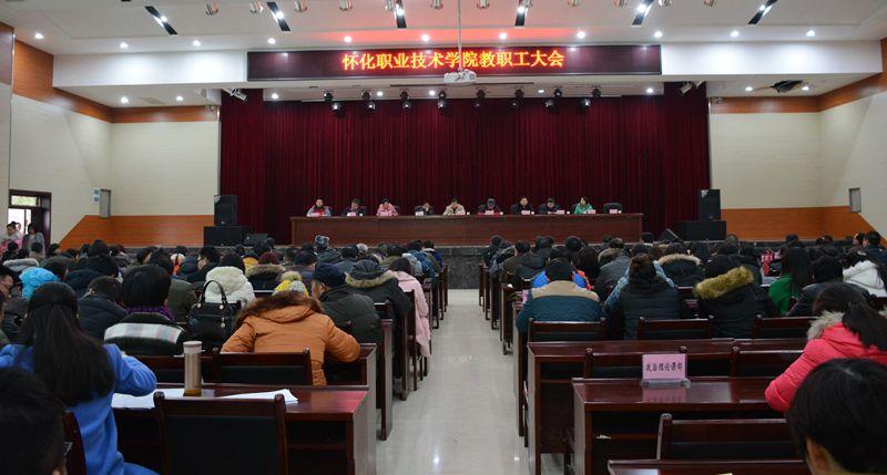 院党委副书记邬国盛代表学院党政班子作学院2015年党政工作总结。2015年,学院以科学发展观为指导,认真贯彻落实党的十八届四中、五中全会精神,紧紧围绕市委“一个中心、四个怀化”的总目标,坚持“狠抓校纪校风建设,走内涵发展道路,创新体制机制,促进文明、和谐、安全、稳定”的工作思路,认真开展“三严三实”专题教育,顺利完成了年初制定的各项目标任务,学院示范校建设、办学特色的培育工作、依法治校、党的建设等工作都在今年期间取得重大突破或进展。